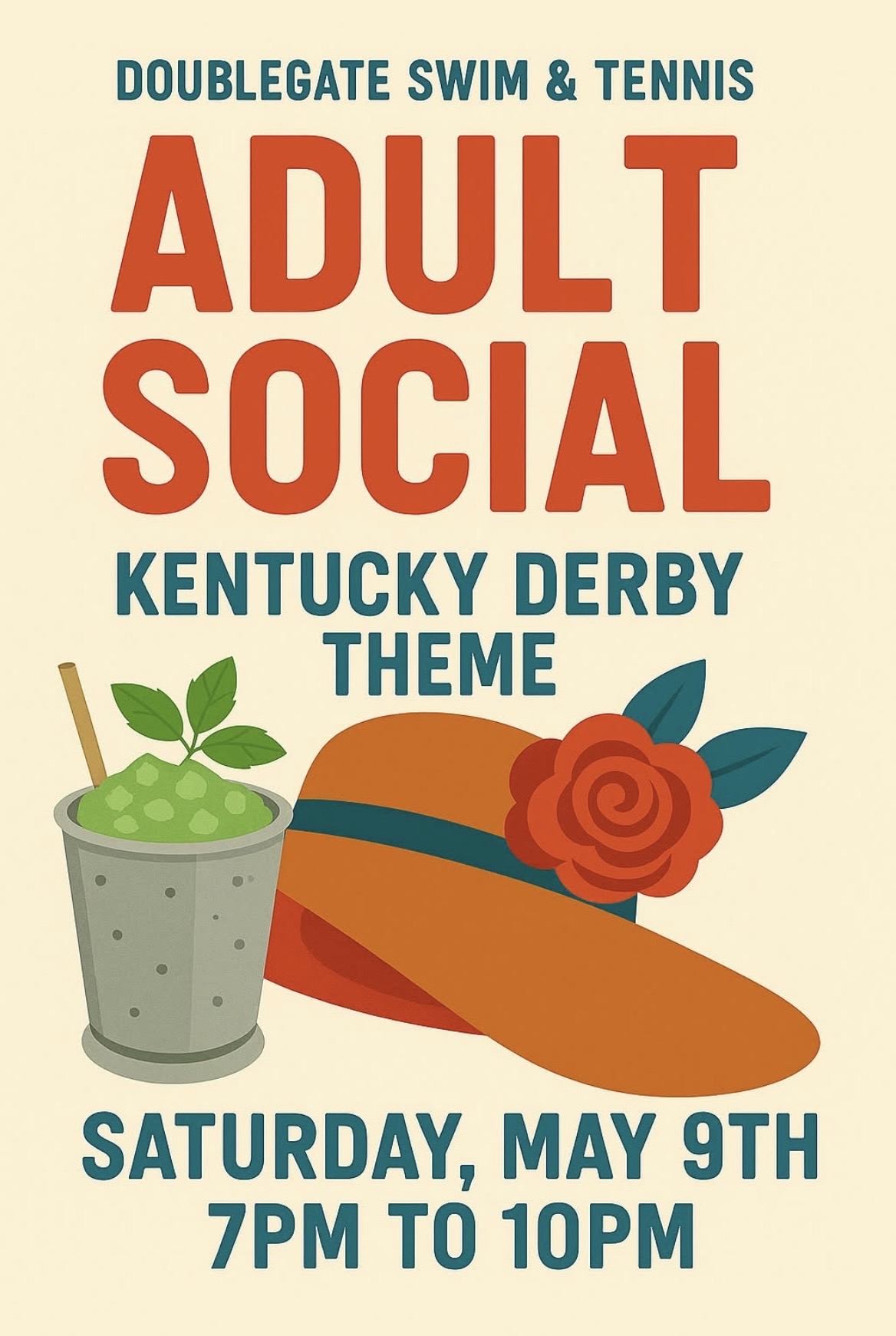 The 2026 DoubleGate Adult Social is Saturday, May 9th from 7 to 10pm on the DGST pool deck. All adult DoubleGate HOA members and DGST members are invited!